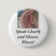 A pin with a picture of a hand behind an ear and the words, "Speak Clearly, Speak Slowly, Please!"