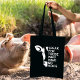 This "Speak for Those Who Have No Voice" tote bag features a cow with black lettering.