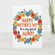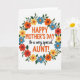 This card features a bright Mother’s Day greeting for an aunt, centered on a white background and surrounded by a ring of flowers that feels like a gentle hug ❤️. The main line “HAPPY MOTHER’S DAY” sits in the middle in orange, with “AUNT!” also standing out in the same warm color. Between them, the smaller words “to a very special” appear in a softer, flowing lettering style, adding a tender pause like a fond smile shared between family. The text is stacked in a neat vertical layout, making your eyes move naturally from the big greeting down to the aunt message. Around the wording, a floral garland forms an oval frame, mixing marigold yellow, sky blue, terracotta orange, and deep red blossoms for a friendly, springtime feel 🌼. Each flower has a contrasting dot at its center, giving the petals a little extra depth and charm without crowding the message. Dark green leaves and thin branches weave between the blooms, creating a balanced wreath that wraps evenly around the centered text.