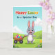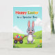 This greeting card features a cheerful long-eared bunny in soft grey and white, standing front and center with a wide smile and bright blue eyes, arms open as if inviting a hug 🐰. Beside it sits a rustic wooden cart filled with glossy decorated eggs, and the bunny’s gentle lean toward the cart gives the scene a friendly, caring connection. The eggs are patterned with stripes, dots, and little stars in pink, orange, yellow, and turquoise, adding a festive touch without feeling busy. Behind them, a spring landscape stretches out with rolling green grass, a gradient blue sky, and a few fluffy white clouds drifting above. Small purple and yellow wildflowers are scattered through the foreground, like tiny gifts placed along the path 🌷. Across the top, a multi-colored greeting is set in large, easy-to-read letters, with “Special Boy” standing out as a key phrase in matching bright tones. The bunny’s bright blue eyes sit under softly shaded ears, and the cart’s wooden slats are drawn with simple texture lines.