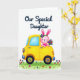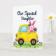 Designed with a cheerful digital illustration, this card features a soft pink long-eared bunny peeking out of the open top of a bright yellow toy-like car 🐰. The bunny’s big eyes and gentle smile, along with a small heart mark on its chest, give it a tender, affectionate look, as if it’s on its way to someone loved. A simple flower crown rests on its head, and one paw holds a tiny bouquet that adds a sweet, friendly touch 🌷. The car has rounded edges with small blue accents, keeping the scene light and childlike without feeling busy. Along the bottom, a green strip of grass is scattered with small wildflowers in red, blue, orange, and purple. Near the top, the words “Our Special Daughter” are placed prominently in dark blue lettering against the white background. The background stays plain white, making the yellow car, pink bunny, and colorful flowers stand out clearly.