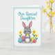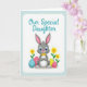 This design shows a friendly long-eared bunny 🐰 centered on a white background, shaded in soft gray with pink inner ears and big blue eyes that catch the light like it’s sharing a tender, knowing look. A small yellow bow tie sits at its neck, and its paws are held together in front, giving it a sweet, polite posture that feels affectionate and close. Near the bottom, three egg shapes rest around its feet: one speckled teal, one bright fuchsia with white dots, and one sunny yellow, adding a spring celebration feel 🌷. On both sides, simple golden-yellow flowers rise on slim green stems, framing the bunny like gentle companions. Across the top, the words “Our Special Daughter” appear in aqua lettering, centered and easy to spot against the white space. A light blue border runs around the edge with a dashed, stitch-like line that keeps the layout tidy and contained. The teal egg sits slightly left of center beneath the bunny, while the fuchsia dotted egg and yellow egg balance the right side near the base.