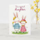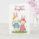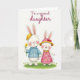 On the front of the card, two upright rabbit figures stand together on a white background, their linked hands showing a gentle, caring bond 🐰. A taller rabbit in a blue checkered shirt and a sunny yellow cap holds up a yellow flower with a green stem, angled toward the smaller rabbit as if offering it with affection. The smaller rabbit wears a pink dress with tiny flower patterns and a matching sun hat topped with a red bow, leaning in with an open-mouthed smile that feels friendly and close 🐇. A slim strip of green grass runs along the bottom, giving the scene a springtime setting without adding clutter. Soft pastel tones and light shading add rosy cheeks and subtle fabric texture, making the pair look cozy and approachable. Near the top, the phrase “To a special daughter” is centered in a flowing dark gray style, spaced clearly above the illustration. The yellow cap and flower stand out against the white space, while the pink dress and red bow add warm contrast above the green grass.