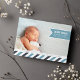 Add your favorite landscape oriented newborn photo to this modern full-bleed announcement and share your joy with friends and family. Design features your baby boy's name, birthdate and birth stats on a sky blue ribbon banner, with your family greeting displayed atop a bottom border of diagonal stripes in white, navy and sky blue.