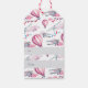 Sweet watercolor gift tags feature a wrapped present floating down on a red and white parachute, with "special delivery" beneath. Tags reverse to a pattern of vintage biplanes and parachutes with space for hand writing the gift giver and recipient's names.