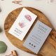 Lighthearted vertical business cards for your gifting service or event planning business feature a whimsical watercolor illustration of a wrapped package descending on a striped parachute balloon, with your name and business name or title beneath. Personalize the reverse side with your contact information, including three social media icons and a template field for your social media username.