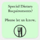 Place this sticker on Menu's. Text reads "Special Dietary Requirements? Please let us know". With icon style picture of a plate and knife and fork. You can change the text, background color as well as add or remove the image.