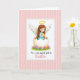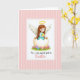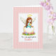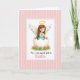 This card features a youthful, animated girl with long auburn hair, small white wings, and a golden halo, rising from a cracked eggshell as if stepping into spring. She wears a teal dress and holds a smooth golden egg close to her chest, her gentle gaze suggesting she’s saving it for someone dear 🐰. A patch of green grass beneath her is sprinkled with tiny blossoms in pink, purple, and yellow, adding a sweet, shared-garden feel 🌷. The illustration sits inside a white rectangular frame with a dashed border, keeping the scene neatly contained. Behind the frame, a pastel pink background with thin white vertical stripes softens the look and adds light depth. Below the picture, the message “For a very special girl on Easter” appears centered near the bottom in a flowing dark gray style. The cracked eggshell curves upward in pale cream tones, with jagged edges framing her knees as she stands in the grass.
