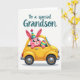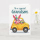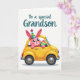 This card shows a bright pink long-eared bunny leaning out of the driver’s window of a small retro yellow car, smiling as if greeting someone it cares about 🐰. A striped cone party hat with a little pom-pom sits on its head, adding a light, celebratory touch. The bunny’s wide eyes and forward-leaning pose suggest an eager arrival, like it can’t wait to share a moment with a loved one. The car is sunny yellow with a few silvery accents, and its rounded shape gives the scene a friendly, old-fashioned look. On the passenger seat rests a patterned oval egg decorated with bands of teal, pink, yellow, and orange, like a sweet surprise brought along for someone special 🌷. Near the top, the message “To a special Grandson” is placed in teal lettering, centered above the illustration. Soft shading and gentle highlights give the characters and car a slightly raised, storybook look against the white background. The oval egg’s stripes and dots are neatly arranged, with teal and pink bands standing out most on the seat.