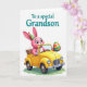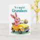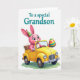 This card features a round, pink, bunny-like character with long ears and wide, gentle eyes, wearing a green-and-yellow striped party hat that adds a friendly, festive touch 🐰. The character sits in a shiny yellow vintage-style convertible with curved lines and silvery chrome details, as if heading out to celebrate someone special. Nestled close in one paw is a large oval egg decorated with horizontal bands of teal, pink, yellow, and orange, held like a treasured gift meant for someone they adore. In the back of the car, a rustic woven basket with a small tuft of green foliage suggests a thoughtful stop for treats and little surprises 🌷. The scene rests on a small patch of green grass, while the rest of the background stays bright white, making the colors stand out without feeling busy. At the top, teal text reads “To a special Grandson,” centered above the illustration and spaced so it feels neatly balanced. Soft, even lighting smooths the shapes and gives the character a tender, affectionate look as it leans toward the decorated egg. The yellow car’s polished chrome bumper and rounded headlights gleam beneath the teal heading.