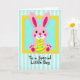 Designed with a cheerful spring look, this card features a front-facing pink bunny with upright ears, rosy cheeks, and rounded paw pads 🐰. The bunny sits inside a teal-blue rectangle edged with a golden-yellow border, drawing your eye to the center. Behind it, alternating vertical stripes in soft teal and white create a neat, breezy backdrop. In its paws, the bunny holds an egg-shaped treat in bright yellow, decorated with diagonal stripes and small turquoise dots, like a sweet gift shared between friends 🐇. The bunny’s gentle smile and open posture suggest a caring, friendly moment, as if it’s offering the egg to someone close. Along the bottom, the message “To a Special Little Boy” appears in black lettering, centered beneath the framed illustration. The egg shows turquoise dots scattered between the yellow diagonal lines.