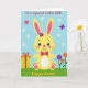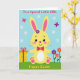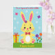 This card features a stylized long-eared bunny in sunny yellow with pink inner ears, nose, and paw pads, smiling softly as if sharing a sweet moment with the viewer 🐰. Rosy cheeks and wide, gentle eyes add a friendly, affectionate look, like a quiet bond between close friends. A red bow tie with small white dots sits neatly at the neck, and a tiny purple flower rests on top of the head for a dainty touch 🌷. The background is sky blue with small white snowflake-like shapes scattered around, along with light pink and purple butterfly accents drifting nearby. Along the bottom, a strip of green suggests spring grass, grounding the bunny as it sits upright in the center. On the left, a wrapped gift shows yellow and blue dots and is tied with a red ribbon, like it’s been placed there for someone dear. Across the top, curved red lettering reads “To a Special Little GIRL,” while the bottom displays “Happy Easter” in large yellow letters. Three simple flowers with purple and orange petals rise from the grass on the right side.