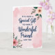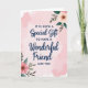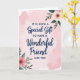 Designed with a soft blush background washed in watercolor-like clouds, this card feels like a quiet hug between close friends ❤️. Centered on the page, the message reads, “IT IS SUCH A Special Gift TO HAVE A Wonderful Friend LIKE YOU,” with most words in a neat, simple print and the phrases “Special Gift” and “Wonderful Friend” in deep indigo flowing lettering. The indigo lines gently stand out against the pale pink, giving the words extra attention without overpowering the airy space around them. In the upper right corner, a creamy peach flower opens outward, its layered petals and warm center leaning toward the message as if listening in. In the lower left corner, a rosy pink bloom mirrors it, creating a sweet back-and-forth balance like two friends reaching toward each other across the page 🌼. Around both flowers, slender stems and mixed green leaves in olive and forest tones add soft depth and a natural frame. The floral clusters sit diagonally opposite—peach blossom at the top right and pink blossom at the bottom left—against the lightly mottled blush background.
