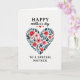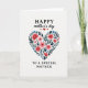 This card features a white background with a large heart shape filled with a lush bouquet, where crimson and soft blush flowers nestle closely together like a caring embrace ❤️. Small blue blossoms peek out between deep teal and blue-green leaves, adding gentle contrast and a calm, friendly mood. The curved stems and layered petals give the arrangement a tender, romantic softness, as if the flowers are leaning toward one another. Near the top, the word “HAPPY” appears in uppercase serif lettering in a dark tone, set above the smaller words “mother’s day” in a flowing cursive-style line. Three tiny red hearts sit nearby, echoing the affectionate theme without crowding the design 🌼. Beneath the heart, “TO A SPECIAL MOTHER” is centered in a neat serif font, spaced evenly for a balanced look. The heart-shaped floral cluster is packed with red and pink blooms, dotted with light blue florets, and surrounded by cool-toned foliage against the bright white field.