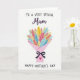 Designed with a bright bouquet centered on a white background, this card feels like a friendly hug in flower form ❤️. Feather-like leaves and sprigs fan upward in soft coral, lemon yellow, teal, and olive green, each one marked with fine line details that add texture and a gentle, affectionate touch. The bouquet sits in a pale pink wrapper with sharp folded angles, giving it a tidy, gift-ready look. A dark bow ties around the wrapper for contrast, and a small red heart rests on the front as a quiet sign of love. Near the top, the text reads “TO A VERY SPECIAL Mum,” with “Mum” written larger in a darker, flowing style that draws the eye. Beneath the bouquet, “HAPPY MOTHER’S DAY” appears in neat, all-caps lettering in a matching dark tone, balanced and easy to read 🌼. The white space around the arrangement keeps everything airy, while the red heart and dark bow stand out against the soft pink wrap. The leaves radiate upward like a fan, with the tallest shapes reaching toward the top line of text.