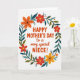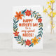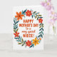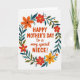 This card features a cheerful Mother’s Day greeting framed by a lively floral wreath, with a caring, close-knit tone that feels like a warm hug ❤️. Centered on the page, the text reads “HAPPY MOTHER’S DAY to a very special NIECE!” with “HAPPY MOTHER’S DAY” and “NIECE!” in warm orange, and the smaller words in between in a coordinating tone. The lettering mixes thicker, attention-grabbing capitals for the main words with a smoother, flowing style for the connecting phrase, guiding your eye gently across the message. Around the words, five-petaled flowers in scarlet, marigold, and soft golden shades suggest a bright bouquet offered with affection 🌼. The blooms are paired with layered leaves in deep teal, olive green, and light sky blue, creating a cozy ring that feels like it’s protecting the greeting. Small dotted accents in orange, yellow, and blue sprinkle around the wreath like light confetti, adding a friendly, celebratory sparkle. The background is plain white, and a small orange star sits among the dots near the wreath.