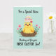 This card shows a chubby bright yellow baby bird nestled in a rustic brown woven nest, gazing forward with shiny black eyes and rosy cheeks that give it a sweet, affectionate look. On its head sits a cracked eggshell-style cap decorated with red, orange, and green dots and stripes, finished with a small red bow, as if it’s dressed up for a first spring celebration 🐣🌷. Slim green stems curl up around the nest, holding tiny pink blossoms that lean inward like they’re keeping the little bird company. The background is a muted teal field that makes the soft yellows, pinks, and greens stand out without feeling loud. Near the top, the words “For a Special Niece” appear in a flowing dark teal style, centered above the bird. Along the bottom, “Breaking out for your FIRST EASTER fun!” is set in a brighter, easy-to-read style, with “FIRST EASTER” emphasized in all caps. Subtle shading on the nest and gentle color fades on the bird’s feathers add depth, while the pink blossoms dot the edges like small confetti 🐰.
