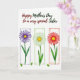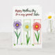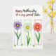 This card features the message “Happy Mother’s Day to a very special Sister” across a bright white background, with the words split between deep red and dark green for a cozy, family-forward look ❤️. The lettering sits near the upper half, leaving plenty of open space so the design feels airy and calm. Below, three stylized flowers line up side by side, like a small garden shared between close loved ones, their colors leaning toward gentle romance and warm friendship. Each bloom sits inside its own softly textured rectangle, giving the layout a tidy, gallery-like feel. On the left is a violet flower with a sunny yellow center inside a lavender-toned frame, its petals spreading outward like an affectionate hello 🌼. In the middle, a white flower with a pale green outline and glowing yellow center rests within a rich green frame, suggesting a tender, caring presence. On the right, a coral-red flower with a bright yellow center sits in a rosy frame, with thin green stems and scattered leaves trailing downward beneath the trio.