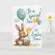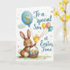 This card shows a soft brown bunny with rosy cheeks, a pink nose, and wide eyes, standing front and center with a woven basket full of decorated eggs 🐰. Beside it, a fluffy yellow chick hovers with wings spread, and the two characters angle toward each other with an affectionate, friendly closeness. A cluster of balloons rises above them, led by a bright blue balloon stamped with a gold letter, followed by round balloons in yellow, pink with tiny hearts, and teal. Gentle, diffused lighting and watercolor-like textures keep the scene light and tender, as if they’re sharing a quiet moment during a spring outing 🌷. The background stays simple with hints of fresh green grass and scattered little star shapes in assorted colors. Near the top, the message “To a special Son at Easter Time” is written in flowing dark lettering, centered above the characters. The eggs show mixed patterns and colors, and the balloons’ strings trail down toward the chick’s wings.