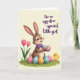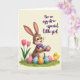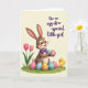 This greeting card shows a long-eared bunny-like character standing on a fresh green patch of grass, smiling with rosy cheeks and wide eyes while holding two decorated eggs close like a sweet gift 🐰. A neat purple bow tie sits at its neck, adding a dressed-up touch that matches the gentle, creamy background. Around its feet, several more eggs rest in the grass with stripes, dots, and flower patterns in pink, blue, yellow, and purple, arranged like a little shared treasure hunt between friends. On the left side, two simple pink tulips rise on green stems, leaning slightly as if they’re part of the bunny’s quiet company 🌷. On the right, a small yellow chick with wings spread looks toward the bunny as though greeting it, giving the scene a friendly, togetherness feel. In the upper right corner, the message “For an egg-stra-special little girl” appears in a dark tone against the pale backdrop, set neatly above the characters. Soft lighting keeps the colors gentle and rounded, with the patterned eggs drawing the eye across the grass. The chick’s bright yellow feathers and the bunny’s purple bow tie stand out beside the pink tulips and the multicolored eggs.