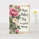 Designed with stylized flowers and aged paper textures, this card feels like a quiet keepsake meant for someone dear ❤️. Along the left side, a large warm pink blossom with a golden center leans toward a smaller white bloom below it, as if the two are sharing a gentle moment. Deep green leaves and thin stems weave around the flowers, creating a soft frame that guides your eye across the front. Behind them, the background looks like layered, timeworn paper pieces with faint, faded writing that suggests old letters tucked away. On the right, a creamy off-white panel with rough, torn-looking edges sits like a note placed carefully on top. Centered on that panel, the message “Happy Mother’s Day to a special Woman” appears in dark lettering that stands out clearly, with the words arranged in neat lines. Soft lighting highlights the petal curves and paper grain, adding a tender, close-to-the-heart feel 🌼. The torn-edged panel is slightly angled against the textured backdrop, with the floral cluster anchored along the left margin.