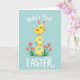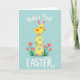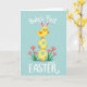 This card shows a bright yellow little bird wearing tall pink bunny ears with darker spots, perched a bit wobbly atop two oversized eggs in a way that suggests a friendly, teasing moment 🐰. The eggs are sunny yellow and decorated with curling blue spiral patterns that wrap around their rounded sides. Behind everything sits a pale sky-blue background sprinkled with many tiny white dots, like light confetti drifting down. Below the eggs, a small cluster of coral-pink tulip-like flowers rises on green stems, each bloom opening to reveal a tiny yellow heart that feels like a quiet nod to affection 🌷. The main text, “Baby’s First Happy EASTER,” appears in rounded white letters, arranged to frame the central stack without covering the character. The words “Baby’s First” and “Happy” sit above, while “EASTER” is placed lower and larger, balancing the design. The pink ears tilt slightly outward, and the blue spirals on the eggs curl toward the right.