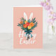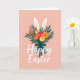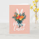 Designed with a tall bouquet as the main focus, this card features layered green leaves and rounded flowers in reds, yellows, and oranges, with a few petals dotted like tiny freckles 🌷. Two long white bunny ears 🐰 peek out from the top of the arrangement, suggesting a shy little visitor leaning in close. The stems are gathered with a deep teal ribbon tied into a tidy bow, adding a calm contrast to the warmer blooms. The background is a soft peach tone that keeps the scene gentle and airy. Near the lower portion, the greeting text sits centered beneath the bouquet in smooth, flowing white lettering. The spacing around the words leaves breathing room, like the message is being offered with quiet care. Subtle shading in the greenery and flowers gives the bouquet a cozy, just-picked look. The teal bow shows two trailing ends that angle slightly outward beneath the stems.