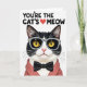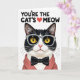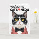 Designed with a crisp white background, this digital portrait features an upright black-and-white cat character with a tuxedo-like coat and a calm, affectionate gaze. Grey-framed glasses dotted with tiny metallic studs sit neatly on its face, giving it a thoughtful look that feels like it’s sharing a private joke with someone close ❤️. Its golden-yellow eyes with narrow pupils shine under even lighting, and a small rosy pink nose softens the contrast of the dark fur. Around its neck is a reddish-salmon collar paired with a dark bow tie sprinkled with lighter specks, adding a dressed-up, date-night touch. Across the top, bold sans-serif text reads “YOU’RE THE CAT’S ❤️ MEOW,” with the heart standing in for the apostrophe in bright red. The lettering is dark and easy to read against the pale background, while the heart pops like a little romantic wink 🌼. Fine fur strands and a subtle gleam on the glasses are highlighted by sharp, balanced lighting.