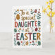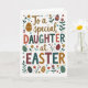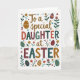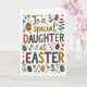 Designed with a bright white background, this digital illustration centers on a friendly Easter greeting that feels like it’s addressed with extra care. Near the top, the words “To a special” and the small “at” sit in a flowing brown style, giving the line a gentle, affectionate tone. The larger words “DAUGHTER” and “EASTER” appear in big capital letters, each letter filled with earthy shades like muted terracotta, deep forest green, and rich burgundy, with tiny dotted or dashed details inside that add cozy texture. Around the text, decorated egg-like ovals are scattered in different sizes, some speckled, some striped, and some with wavy lines, echoing the way friends or family might trade little surprises 🐰. Small flowers and simple leafy sprigs weave between the shapes in soft greens, blues, pinks, and yellows, creating a springtime setting that feels tender and close 🌷. The layout keeps the greeting easy to read, with the smallest words tucked above and between the larger ones so the eye moves smoothly across the design. The letters have a lightly textured look, and the eggs and floral accents sit like a loose frame around the centered message.