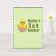 This card features a plump bright-yellow chick peeking out of a cracked pale-brown eggshell in the lower left, its wide dark eyes turned upward as if seeking a caring gaze. A tiny orange beak and a few soft head feathers add to the freshly-hatched look, giving the little character a sweet, friendly presence. Behind it, a soft lime-green background stretches across the scene with faint speckles that look like morning dew catching light 🌷. To the right, the text “Baby’s 1st Easter” appears in an olive-green, thick, easy-to-read font, spaced so it feels balanced against the chick. The gentle curve of the chick’s posture and the open shell create a cozy, welcoming moment, like a small celebration being shared with loved ones 🐰. A wavy border in a deeper green runs around the edges, framing the image like a simple spring garland. The palette stays focused on sunny yellow, earthy brown, and layered greens, with the chick and text standing out against the calm background. The shell pieces show jagged edges with a few small cracks, while the border line ripples smoothly all the way around.