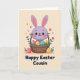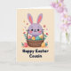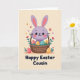 This card features a centered bunny character 🐰 with a soft lavender head and long ears lined in pale pink, gazing forward with wide dark eyes and a small, sweet smile that feels like a friendly hello. Light rosy cheeks and thin dark whiskers add to the gentle look, as if it’s sharing a quiet moment with the viewer. The bunny peeks from behind a rustic woven basket filled with decorated eggs in coral pink, sunny yellow, aqua blue, and soft orange, tucked among fresh green leaves. Around the scene, small flowers in warm reds and oranges mingle with floating heart shapes in light and deep pinks, giving the layout a tender, affectionate tone like a note between close friends 🌷. The background stays a creamy off-white, letting the pastel colors stand out without feeling busy. Below the illustration, rounded lettering sits centered near the bottom in a darker contrasting color, clearly separated from the main artwork. The basket weave is drawn with simple curved lines, and the eggs show tiny dots and speckles scattered across their surfaces.
