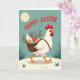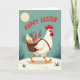This card features a proud white hen striding along a pale path, its red comb and wattle standing out against a calm teal-blue sky. A woven basket is strapped to its back, packed with decorated eggs in yellow, orange, blue, and pink, with stripes, speckles, and dots, plus dark sprigs dotted with red berries. The hen’s forward-leaning posture and bright, watchful eye suggest a friendly errand, like it’s hurrying to meet someone special with a shared treat 🌷. Across the top, “HAPPY EASTER” is set in large red letters that arc over the scene, drawing your gaze downward to the character. In the upper left, a large pale yellow circle sits like a soft sun or moon, adding a gentle glow to the open sky. Small tufts of dark green grass appear near the ground, giving the walkway a simple outdoor setting 🐰. The eggs are nestled tightly together in the basket, with tiny dotted patterns and berry sprigs peeking between them.