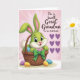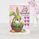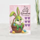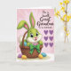 This card shows a bright digital illustration of a green bunny character with big, attentive eyes peeking out from a woven basket, as if shyly sharing a secret with someone close 🐰. The basket is filled with patterned eggs in blue, purple, and yellow, and an emerald green bow sits prominently at the front like a little gift. Behind everything, a soft pink background glows with pale, sunbeam-like rays that spread outward. On the right side, several deep violet hearts float together, hinting at a sweet bond and a gentle, affectionate exchange. A short greeting appears near the hearts in a dark purple, flowing cursive-style font, balanced so it doesn’t crowd the main scene. Below the basket, a few more pastel eggs rest on the ground alongside tiny white flowers that bring in a spring touch 🌷. The eggs show fine speckles and thin decorative lines, while the basket weave is drawn with small, detailed strokes.