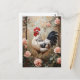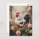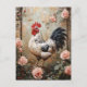 A beautifully detailed oil painting featuring a proud black-and-white speckled rooster standing amidst soft pink roses and rustic wrought iron fencing. The richly textured brushstrokes and vintage garden backdrop evoke a timeless countryside charm, making this artwork perfect for farmhouse decor, kitchen accents, or rustic floral themes.