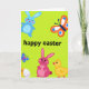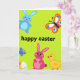 Designed with an electric lime-green background sprinkled with tiny white speckles, this card sets a bright spring scene with a light, airy shimmer 🌷. Centered on the front, a seasonal greeting appears in thick black lettering that stands out strongly against the green. In the upper left, a sky-blue bunny with rosy cheeks drifts as if weightless, angled toward the middle like it’s watching the message with a gentle, friendly focus 🐰. In the upper right, an orange winged insect hovers with white and blue circular markings, adding a lively counterbalance to the calmer bunny. Along the bottom, a rose-pink bunny stands upright, turned slightly toward a small golden chick whose curious eyes and red beak suggest a sweet, companionable moment. A few smaller winged insects dot the space, guiding your eye around the layout without crowding the main figures. Near the lower area sits a striped oval decoration in soft bands of color, nestled among the tiny flying accents.