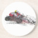 A sharp design of a fast speeding motorcycle racer leaving dust and debris behind him.