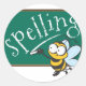 Our cute little bee friend - Buzz - writing the word 'spelling' on the chalk board for his spelling bee.