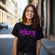 This tee says Spicey in bright pink grungy lettering.