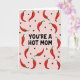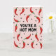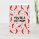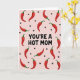 Designed with a cheeky, affectionate tone, this card features the phrase “YOU’RE A HOT MOM” centered in large black lettering that grabs your eye right away. The words sit on a soft pink background, giving the message a sweet contrast that feels flirty and friendly ❤️. Across the whole surface, red chili peppers with small green stems are scattered in different directions, like they’re dancing around the main line of text. Their glossy highlights make them look lively, adding a little heat without feeling harsh. Between the peppers, tiny black heart icons appear here and there, like quiet nods of fondness tucked into the pattern 🌼. The layout keeps the focus on the middle while the repeating shapes create a fun, all-over rhythm. The black text is the only large wording, while everything else stays as simple graphic icons on the pink field. The final look is a pastel pink canvas filled edge-to-edge with red peppers, green stems, and small black hearts surrounding the centered black phrase.