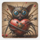 A weird spider cat holding a red glass heart with gold web and spider emblem on it AI generated painting