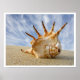 Close-up of a spider conch on beach sand against blue sky with wispy clouds.