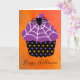 Halloween cute cupcake with a black spider. Black and orange theme colors. Cute purple spider theme.