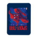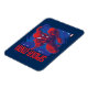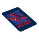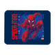 Spider-Man leaps out of this blue, high-tech cutout badge with his name in red along the left side.