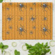 A bright orange background creates a perfectly Halloween-themed base for a repeating pattern of black web crawling with spiders. These spiders, modeled after the false widow, feature a bright white skull on their abdomens and other white markings on their body and legs.