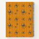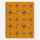 A bright orange background creates a perfectly Halloween-themed base for a repeating pattern of black web crawling with spiders. These spiders, modeled after the false widow, feature a bright white skull on their abdomens and other white markings on their body and legs.