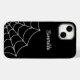 This goth style phone case has a spiderweb graphic in ecru or eggshell white against a black background and is ready to be personalized with a name or other text in matching script or cursive writing.