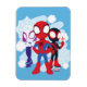 Spidey and His Amazing Friends | Check out Spidey, Ghost-Spider, and Spin together in front of a webbing background.