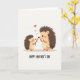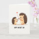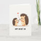 This card shows two stylized spiny forest creatures facing each other on a light cream background, their soft brown backs and tan bellies shaded gently for a cozy, close-up scene. A smaller youngster stands slightly to the left, leaning forward with a tender look as it offers a pink flower with a bright green stem to a larger companion. Both have rosy cheeks, simple black dot eyes, and tiny orange hands and feet, and their relaxed posture suggests easy affection between close family or friends ❤️. Three red hearts float upward above their heads, spaced like a little trail that draws your eye from the gift to the shared gaze. A faint gray shadow beneath their feet hints at a flat surface without adding extra clutter. Centered near the bottom, a short celebratory message appears in dark lettering, standing out clearly against the pale background 🌼. The final detail is the trio of red hearts rising above the pair while the pink flower sits between them.