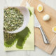 A unique kitchen towel design sports spilled green split peas from a white ramekin. The background is a diagonal ragged edged scratching. Leave it as is or click the orange Customize it! button to add text like a family name or quote. In customize, you can also select a background color other than the pale yellow by going to Edit then Background.