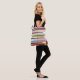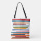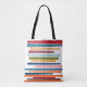 This tote bag has a mid-century modern design of horizontal colored lines on a vertical black line with circles.m
